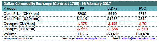 Contract number 1705 on Dalian Commodity Exchange on 16 February 2017 settled as following: