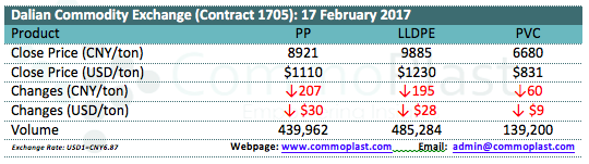 Contract number 1705 on Dalian Commodity Exchange on 17 February 2017 settled as following: