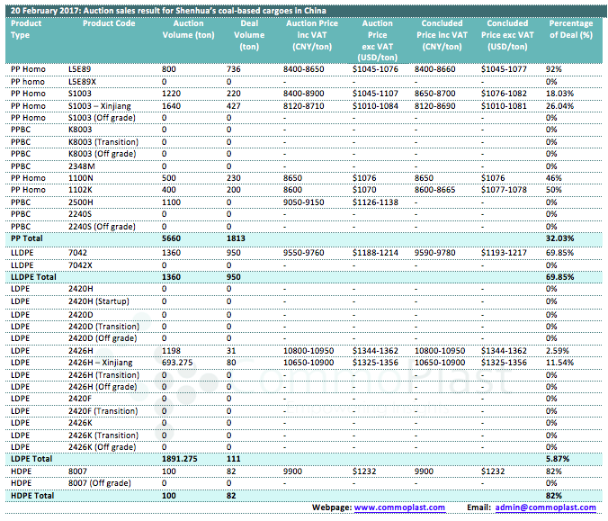 20 February 2017: Auction sales result for Shenhua's coal-based cargoes in China
