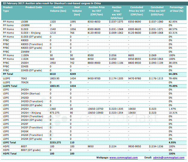 Auctions sales result for Shenhua’s coal-based polyolefin products in domestic China are as following: