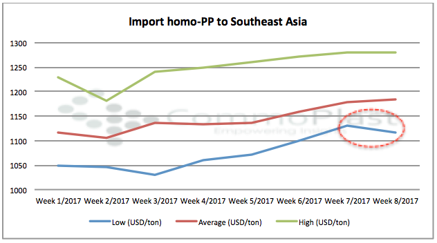 Import homo-PP to Southeast Asia has been steadily firming up since late January in the concern of tightening supply ahead of a series of maintenance shutdown. Besides, strong propylene costs have also provided some support to the current trend. However, the general sentiment seems loosing steam this week with a good number of re-export cargoes from China emerged in Southeast Asia, stemming concern over the near term outlook without the demand in Asia’s largest importer.