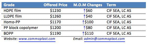 In fact, initial respond from the market is not very positive, pointing to high raw material prices and weak end product demand. An Indonesian buyer commented, “The producer’s LLDPE film price is near to what domestic suppliers are offering on delivered term at the moment. We think that the maker might face difficulties in achieving full hike target.”