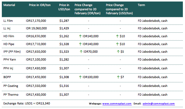 A major producer in Indonesia has announced its new offers for PP and PE in domestic market today with an increased of IDR140,000/ton ($10/ton) for HDPE, IDR70,000/ton ($5/ton) for IPP, IDR100,000/ton ($7/ton) for BOPP meanwhile maintaining stable offers for other grades as compared to last week.