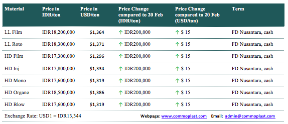 Market players reported that another major producer in Indonesia has implemented IDR200,000/ton ($15/ton) increased for its PE offers in local market today as compared to last week.