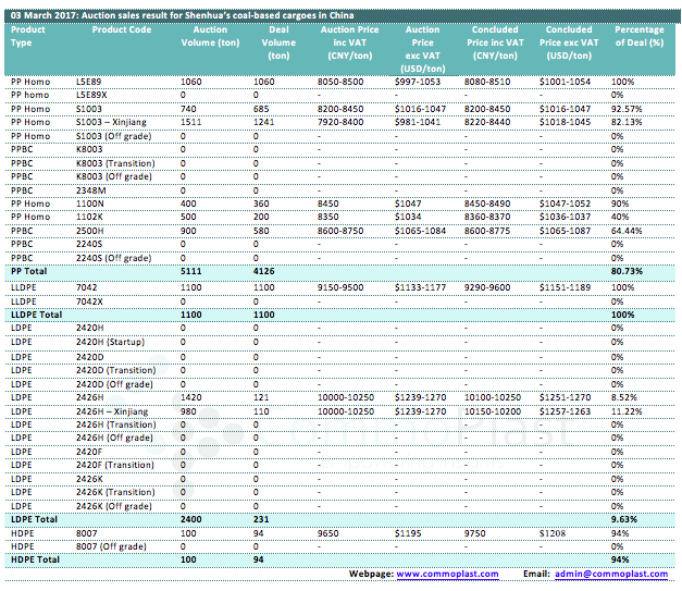 03 March 2017: Auction sales result for Shenhua's coal-based cargoes in China