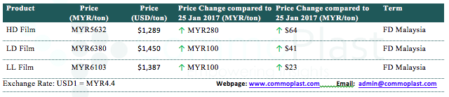 Market players reportedly received new offers from another major maker in Malaysia for March delivery with an increased of MYR280/ton ($64/ton) for HDPE, MYR180/ton ($41/ton) for LDPE and MYR100/ton ($23/ton) for LLDPE as compared to their offers last month.