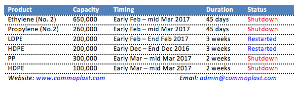 Lotte Chemical Titan (M) Sdn Bhd has reportedly completed the maintenance shutdown work at its LDPE and one of the HDPE units, while other units still remain offline. An update on the company’s shutdown schedule is shown in the following table: