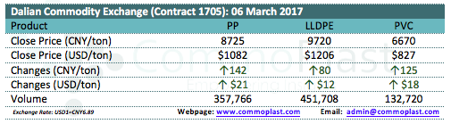 Contract number 1705 on Dalian Commodity Exchange on 06 March 2017 settled as following: