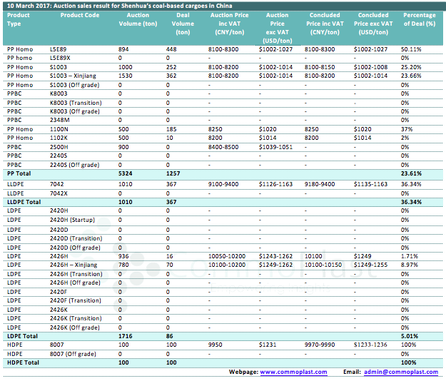 10 March 2017: Auction sales result for Shenhua's coal-based cargoes in China