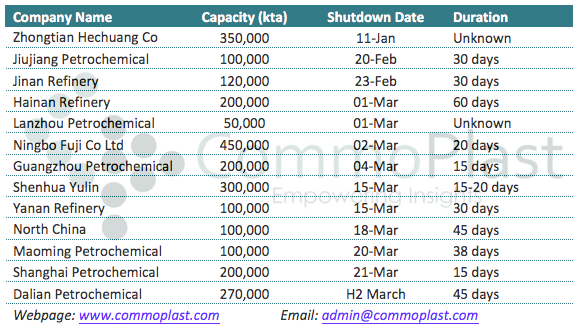 This take place even with a good number of PP plants within China undertake maintenance shutdown in February and March. The following table shows the detailed overhaul schedule at these plants.