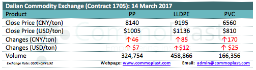 Contract number 1705 on Dalian Commodity Exchange on 14 March 2017 settled as following: