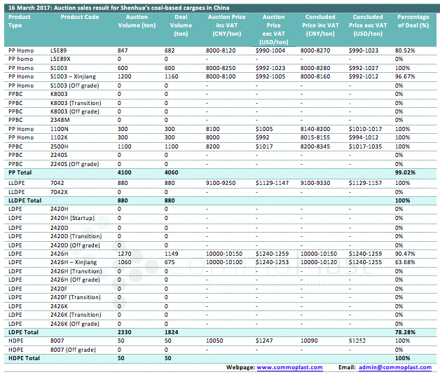 Auctions sales result for Shenhua’s coal-based polyolefin products in domestic China are as following: