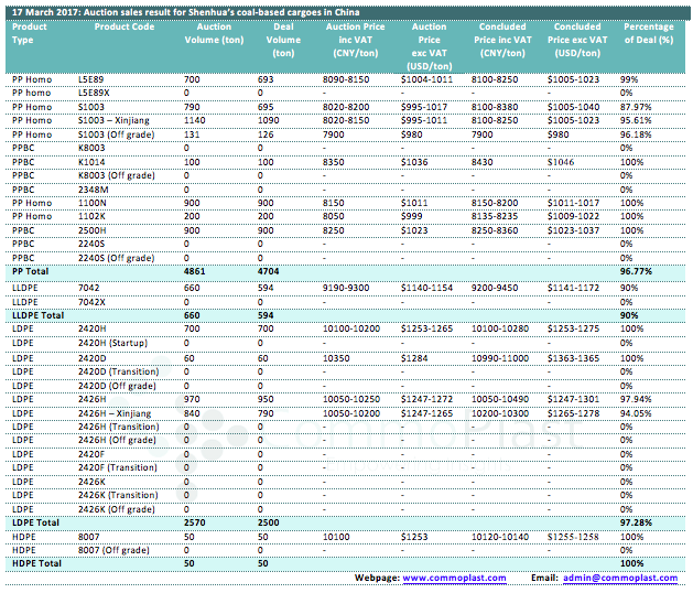 Auctions sales result for Shenhua’s coal-based polyolefin products in domestic China are as following: