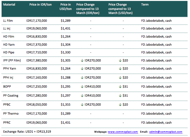 A major maker in Indonesia has announced its new offers for local market today with reduction of IDR270,000-410,000/ton ($20-31/ton) for PP, meanwhile maintaining stable offers for PE as compared to last week.