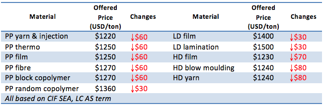 According to market sources, a major Southeast Asian producer has announced fresh PP and PE offers for April delivery to regional buyers with reduction compared to last month. The maker’s price list is shown in the following table: