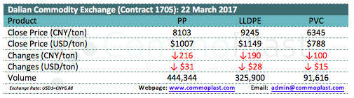 Contract number 1705 on Dalian Commodity Exchange on 22 March 2017 settled as following: