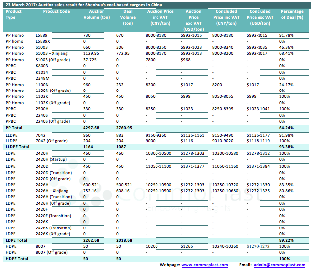 Auctions sales result for Shenhua’s coal-based polyolefin products in domestic China are as following:
