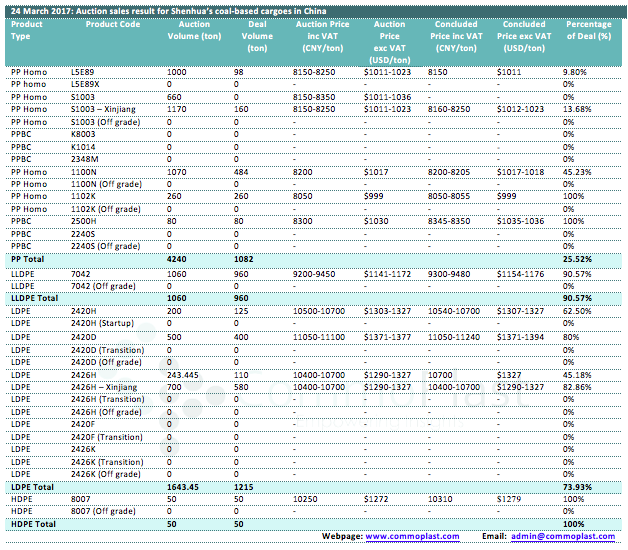 24 March 2017: Auction sales result for Shenhua's coal-based cargoes in China