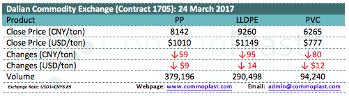Contract number 1705 on Dalian Commodity Exchange on 24 March 2017 settled as following: