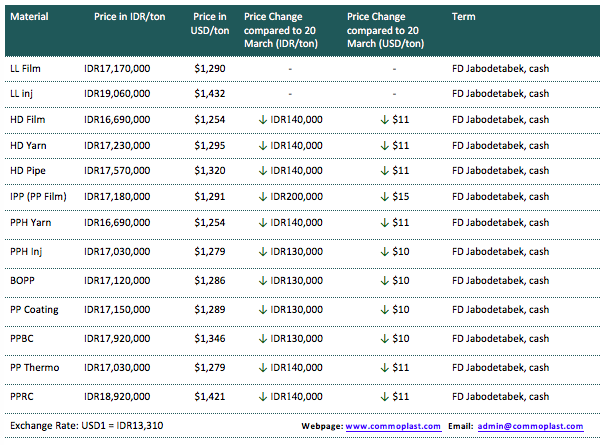 A major producer in Indonesia has announced its new offers for domestic market today with a decrease of IDR140,000/ton ($11/ton) for HDPE, IDR130,000-140,000/ton ($10-11/ton) for PP meanwhile maintaining stable offers for LLDPE as compared to last week.