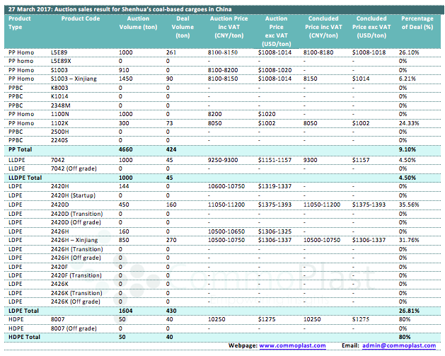 27 March 2017: Auction sales result for Shenhua's coal-based cargoes in China