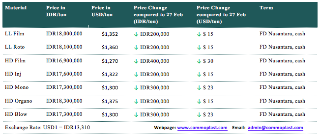 Market players reported that another major maker in Indonesia has implemented IDR200,000/ton ($15/ton) reduction for LLDPE offers and IDR200,000-400,000/ton ($15-30/ton) for HDPE offers in local market today as compared to last month.