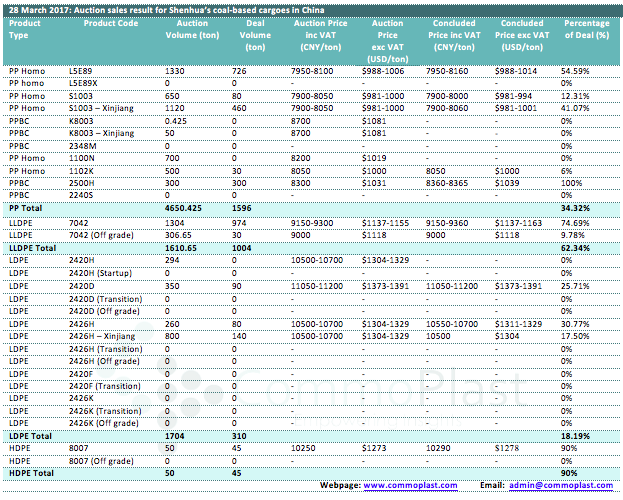 Auctions sales result for Shenhua’s coal-based polyolefin products in domestic China are as following: