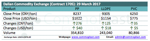 Contract number 1705 on Dalian Commodity Exchange on 29 March 2017 settled as following: