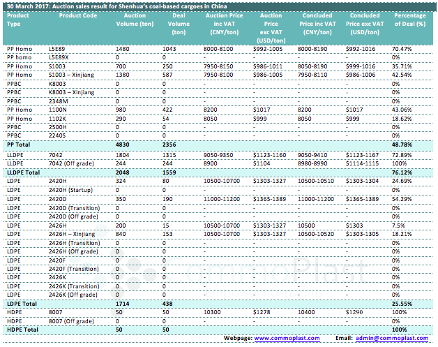 Auctions sales result for Shenhua’s coal-based polyolefin products in domestic China are as following: