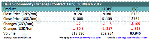 Contract number 1705 on Dalian Commodity Exchange on 30 March 2017 settled as following: