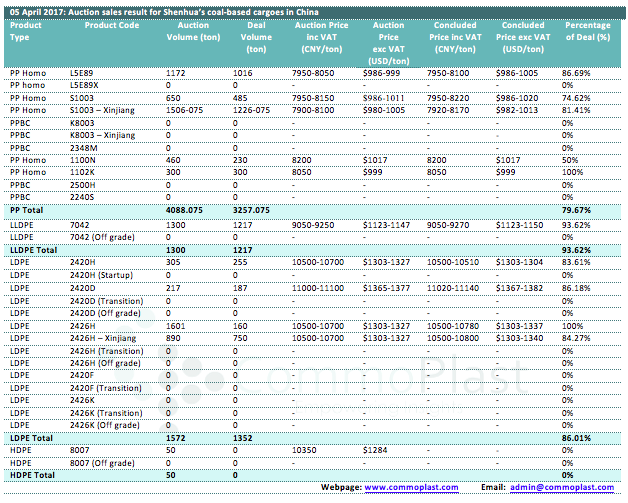Auctions sales result for Shenhua’s coal-based polyolefin products in domestic China are as following: