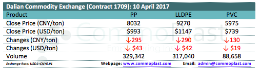 Contract number 1705 on Dalian Commodity Exchange on 10 April 2017 settled as following: