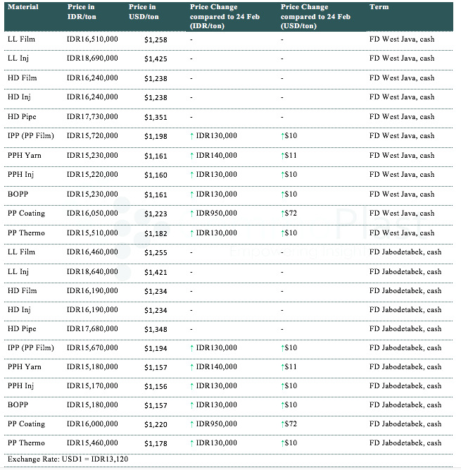 A major Indonesian producer announced new offers for this week with further price hike for PP compared to last offer level on Wednesday, 24 February 2016. The producer's latest price changes are shown in the following table: