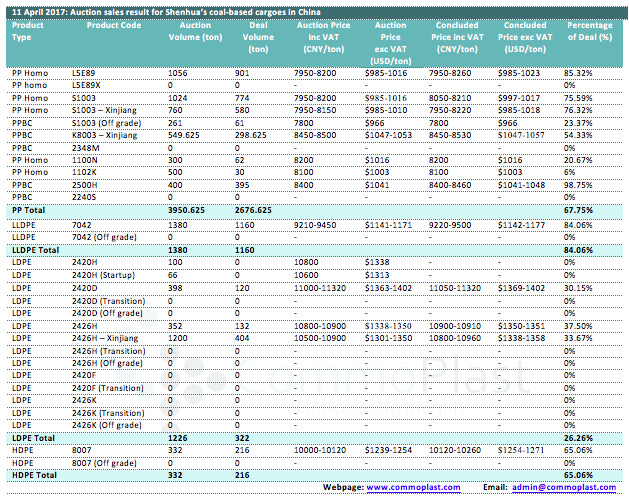 Auctions sales result for Shenhua’s coal-based polyolefin products in domestic China are as following:
