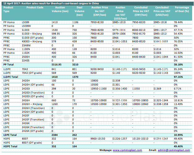 12 April 2017: Auction sales result for Shenhua's coal-based cargoes in China