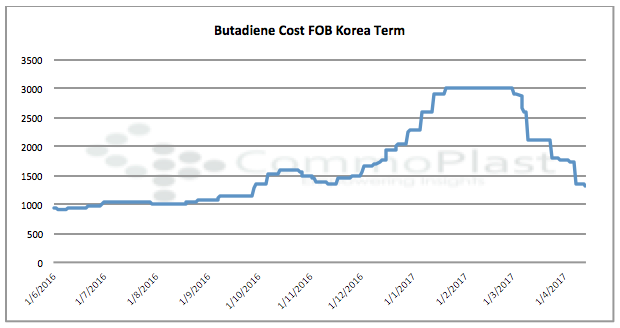 The Asian butadiene market has been steadily going down since early March this year after hitting multi-years high level on healthy demand and limited availability. Compared to March, butadiene based on FOB Korean term has fallen about $1700/ton, to settle at $1300/ton on Thursday.