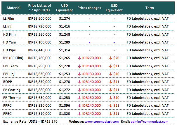 A major Indonesian producer has announced fresh offers to domestic market with reduction of IDR270,000/ton ($20/ton) for IPP, IDR130,000-140,000/ton ($10-11/ton) for other PP grades meanwhile maintaining stable offers for PE as compared to last week.