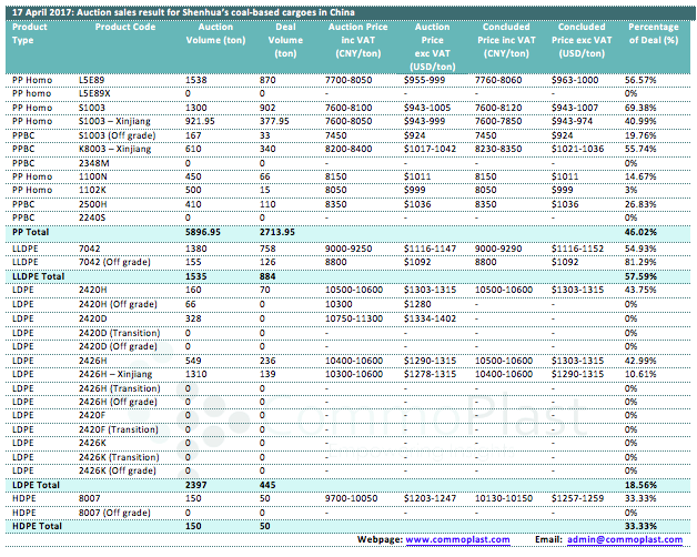Auctions sales result for Shenhua’s coal-based polyolefin products in domestic China are as following:
