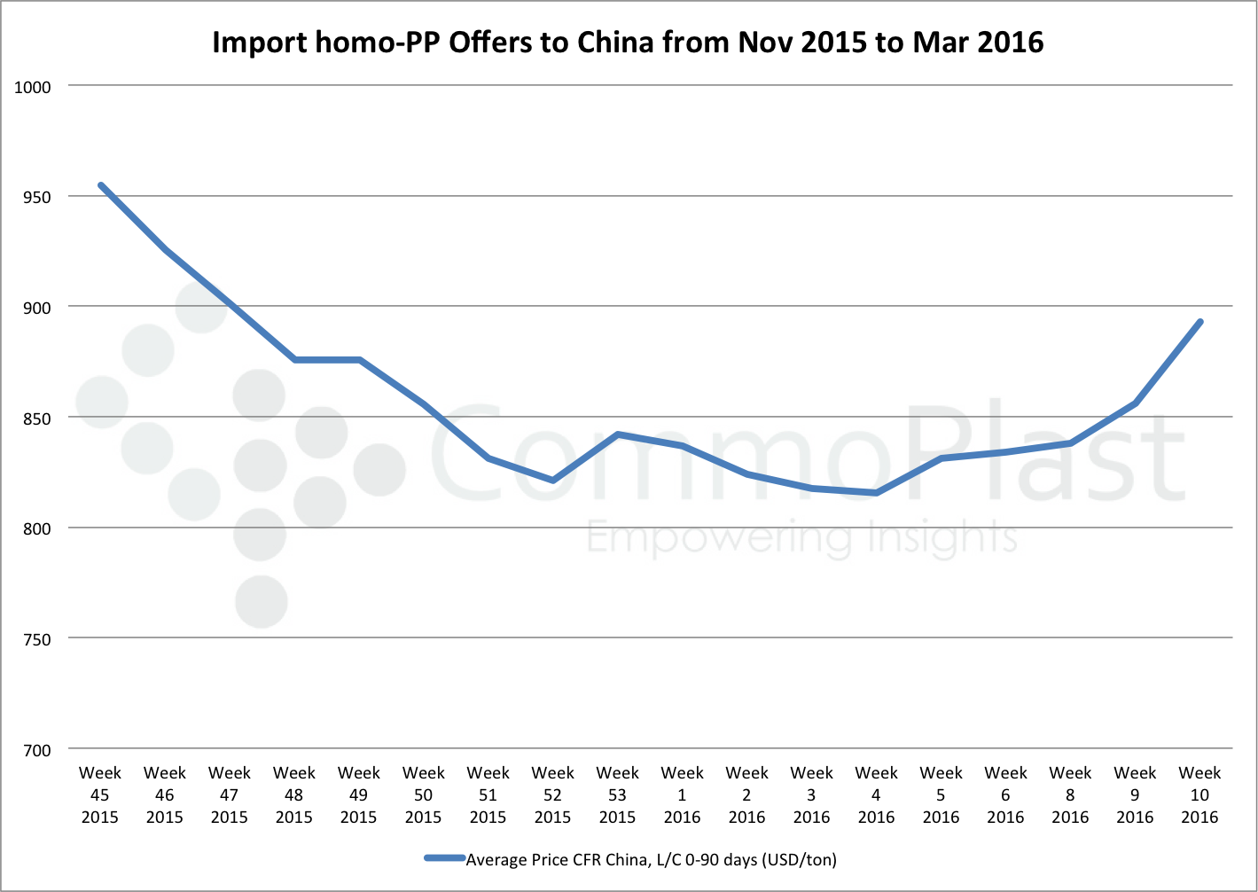 In China, import homo-PP prices has been following the firming trend since late Jan 2016 as the market prepared for pre-holiday replenishment and this week, prices have climbed above $900/t threshold for the first time since late November 2015, according to CommoPlast’s records.