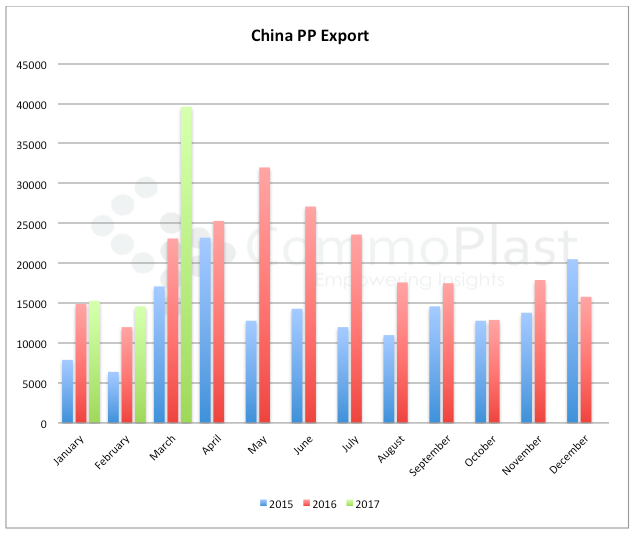 According to the latest data released by the Chinese Custom Department, export homo-PP from the country in March 2017 surged 63 per cent from February to reach the highest level seen in more than two year.