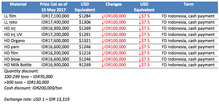 Indonesian buyers reported to have received fresh weekly offers from another major PE producer in the country with IDR100,000/ton ($7.5/ton) reduction. A number of buyers have expressed the intention to place lager bids for the cargoes despite several discount schemes including quantity and cash discount available, which accounted for up to IDR330,000/ton ($25/ton) deduction from initial prices.