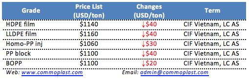 Another Saudi Arabia producer has announced fresh PP and PE offers to Vietnam today with reduction from last month. The maker implemented $40/ton cut on PE cargoes while PP witness a drop ranging $20-40/ton.