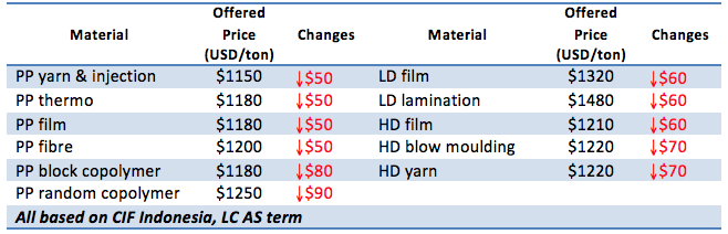 It is reported that a major Malaysian producer has announced fresh PP and PE offers to Indonesia with larger than usual reduction due to persistent weak demand in this market and pressure from the general downtrend across the region. Initial respond from Indonesian buyers is not very positive and many planned to request for additional discount, considering competitive local prices.