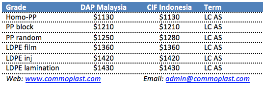 According to market sources, another major Southeast Asian producer has announced June shipment offers for PP and LDPE with reduction from last month. In fact, the maker implemented $40/ton cut on LDPE cargoes while decreasing PP prices by $30/ton for homo-PP and $50/ton for copolymer grades.