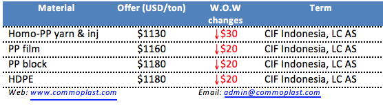 A major Thailand producer reportedly announced fresh weekly PP and HDPE prices to Indonesia with reduction on the back of persistent weak demand and continuous falling local offers in this market.