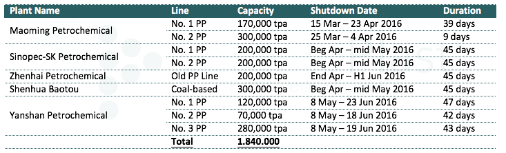 Sinopec-SK Petrochemical, Zhenhai Petrochemical and Shenhua Baotou will simultaneously shutdown their PP lines in April for approximate 45 days. Meanwhile, Yanshan Petrochemical would shut all three PP lines with total capacity of 470,000 ton/year for about 40-45 days starting May 2016. Detailed scheduled shutdown at Chinese PP plants is shown in the following table.