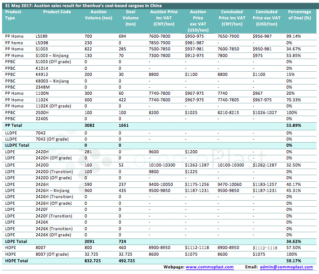 Auctions sales result for Shenhua’s coal-based polyolefin products in domestic China are as following: