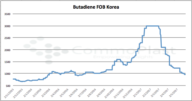 The butadiene costs based on FOB Korea term has been steadily going down since late February, and hit the lowest level since late June 2016 this week on persistent bloated supply and weak demand.
