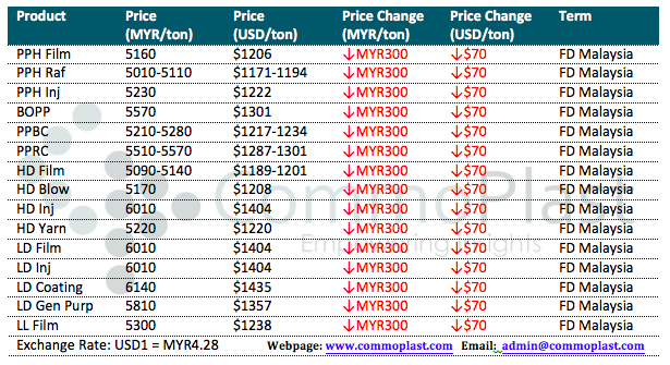 Malaysian buyers reported to have received fresh offers for June delivery from a major domestic producer with MYR300/ton ($70/ton) reduction from last month for all PP and PE grades. The reduction is larger than expected, which players attributed to the strengthened Rinngit and anticipated further drop in demand due to Ramadan month.
