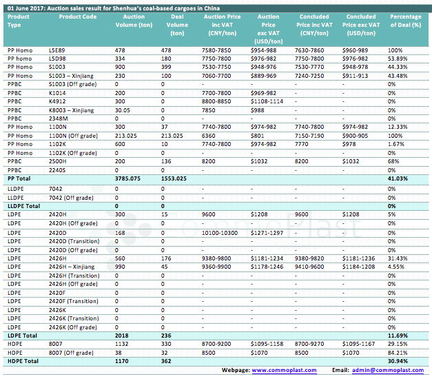 Auctions sales result for Shenhua’s coal-based polyolefin products in domestic China are as following: